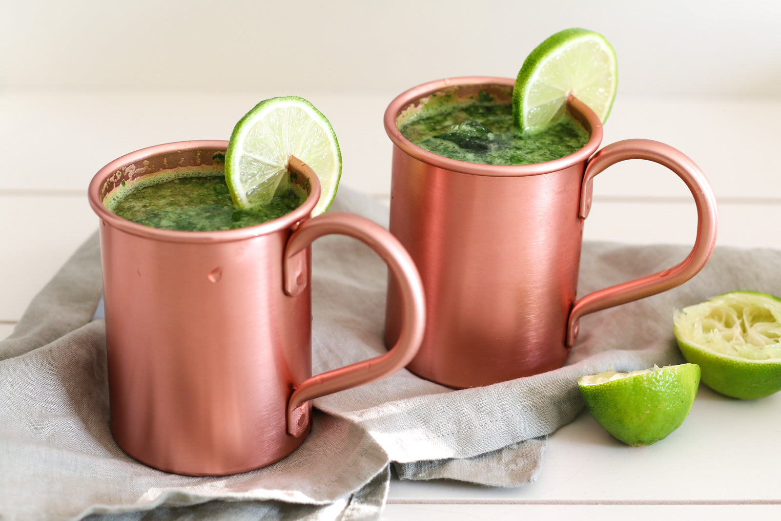 Die Gurke, Basilikum, Limettensaft und das Eis kommen zusammen in den Hochleistungsmixer. Dann wird alles kurz gemixt, bis der Inhalt in grobe Stücke zerteilt ist. Danach den Inhalt auf 4 Gläser aufteilen und mit Sprudelwasser aufgießen. Je nach Bedarf können noch Eiswürfel hinzugegeben werden. Zur Dekoration empfehle ich noch eine Scheibe Limette und einen hübschen Strohhalm. Besonders toll kommt der Cocktail in den hübschen Kupferbechern zur Geltung. Und das tolle ist, darin bleibt er auch recht lange frisch gekühlt.